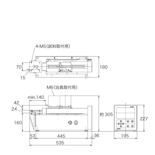 ■標(biāo)準(zhǔn)規(guī)格| 模型 | SH-14NB-□ * 1 | | 最大負(fù)荷 | 500N | 有用的功能 | 測(cè)試條件內(nèi)部存儲(chǔ)器保持功能 峰值/谷值保持功能 循環(huán)操作功能 斷點(diǎn)檢測(cè)功能 起點(diǎn)檢測(cè)功能 自動(dòng)取消/自動(dòng)進(jìn)給功能 自動(dòng)原點(diǎn)返回功能 結(jié)果通過(guò)/失敗判斷功能 | | 負(fù)荷顯示 | 請(qǐng)參閱“負(fù)載范圍規(guī)格”表請(qǐng)參閱 “按型號(hào)劃分的負(fù)載范圍組合表” | | 最小單位 | | 負(fù)載精度 | JIS 1級(jí)試驗(yàn)機(jī)(測(cè)量指令值的±1%以?xún)?nèi)) | | 最小排量單位 | 0.01毫米 | | 驅(qū)動(dòng)系統(tǒng) | 無(wú)刷直流電機(jī) | | 速度范圍 | 5至500毫米/分鐘 | 外部輸出* 2 | USB | | 中風(fēng) | 200mm(無(wú)夾具) | 電源供應(yīng) | AC100V 5A | | 工作臺(tái)尺寸 | 100 x 100毫米 | 體重 | 約24公斤 | | 安全設(shè)備 | 任意設(shè)定上下限開(kāi)關(guān),過(guò)載自動(dòng)停止 | 外形尺寸* 3 | 寬535 x深180 x高305毫米(圖紙顯示) | * 1在□欄中輸入載荷符號(hào)模型。請(qǐng)參照“各型號(hào)的負(fù)荷范圍組合表”。 * 2可以添加用于模擬或打印機(jī)的可選外部輸出。